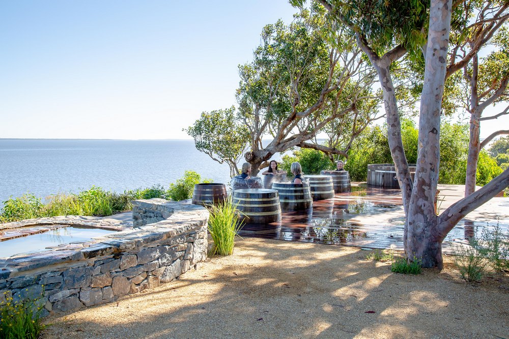 Set on a natural 25-acre site overlooking the magnificent Gippsland Lakes, Metung Hot Springs offers a range of geothermal hot pools and bathing barrels, day spa, reflexology walk, architecturally designed sauna, cold plunge pool, geothermal showers, coffee hut and relaxation areas.